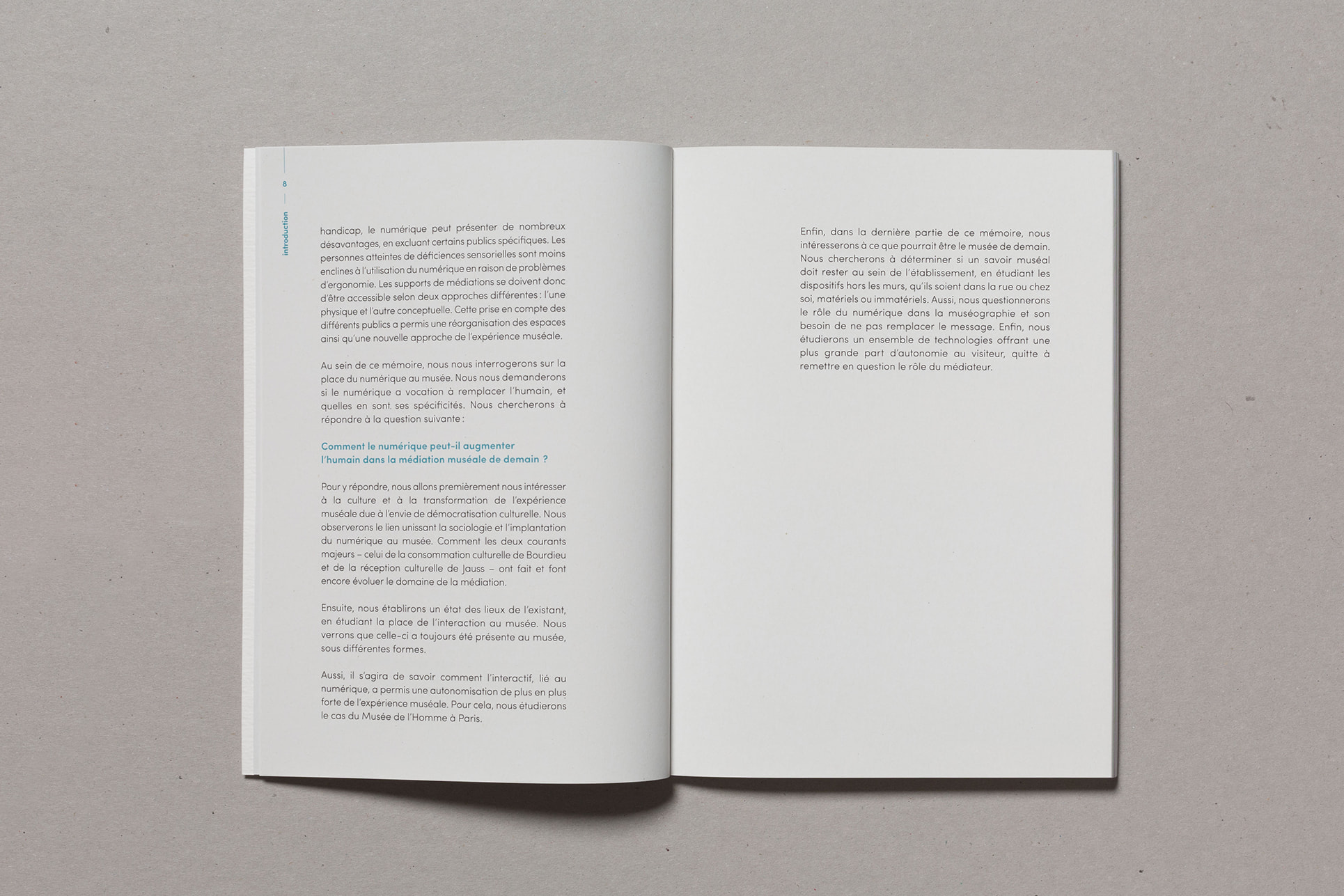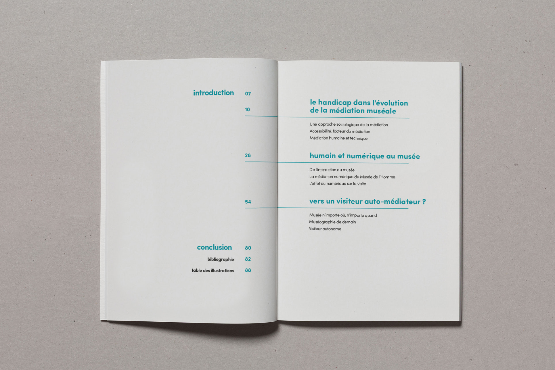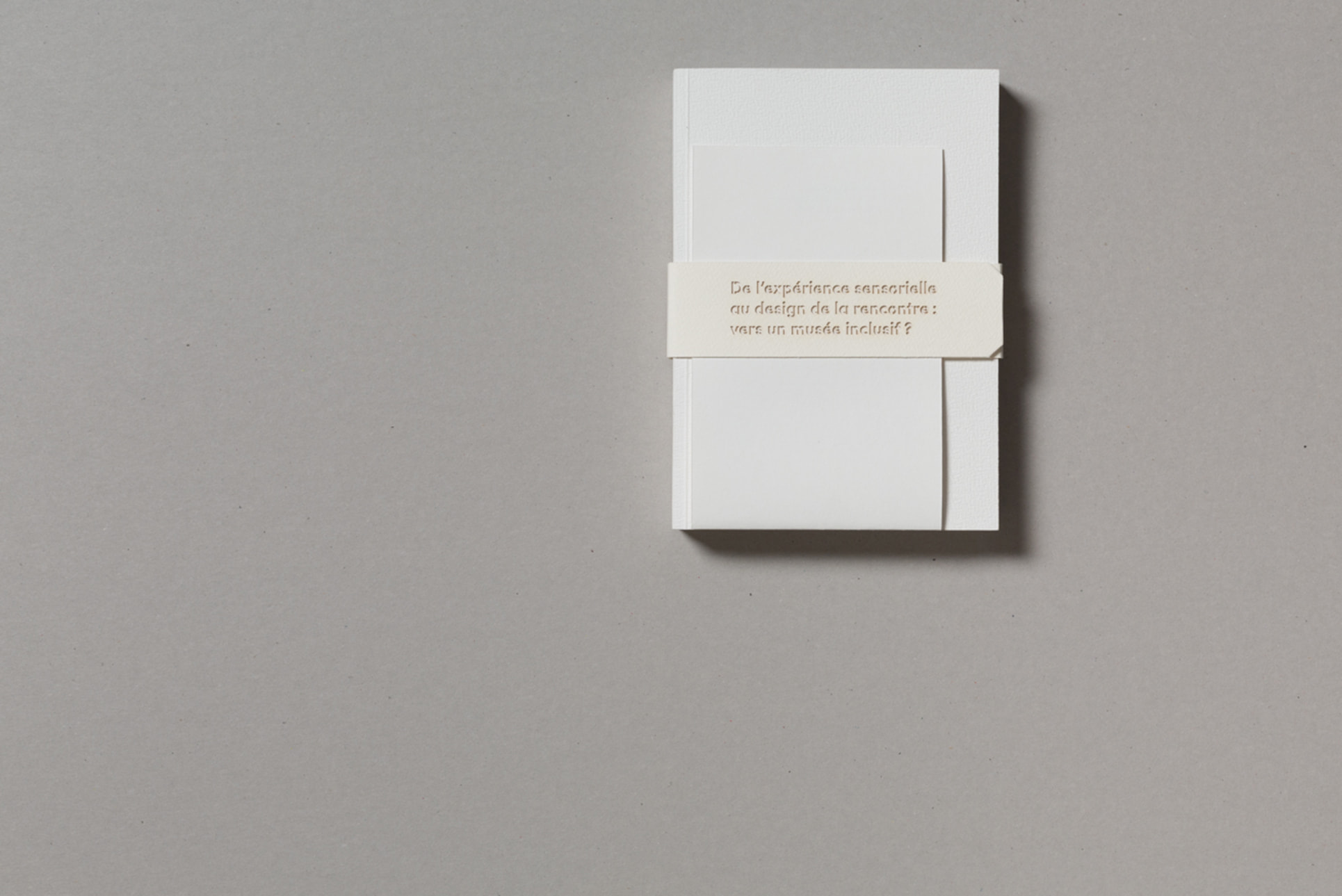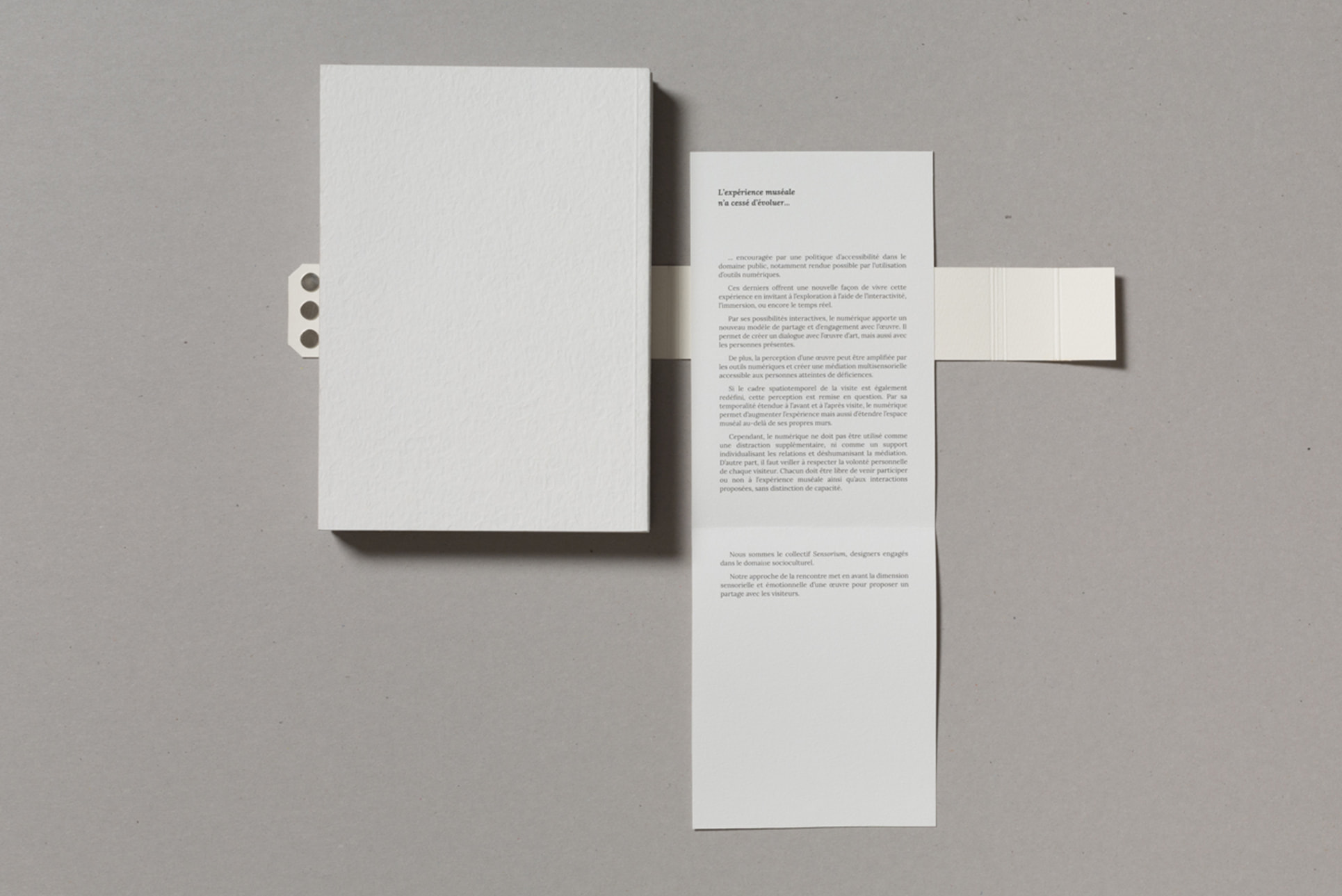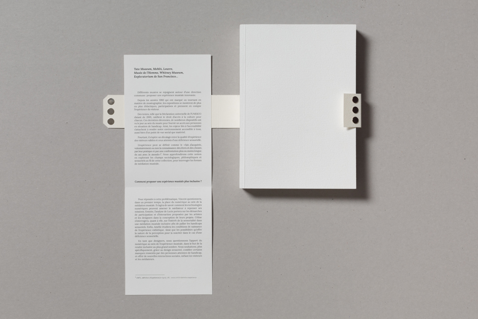 Notre projet de diplôme traitant de l'accès à l'art à tous et notamment aux déficients sensoriels, nous avons choisi de mettre en avant la matière. Ainsi, nous avons souhaité laisser le papier vierge de toute information sur la couverture. La perception sensorielle est mise en avant, chaque couverture possédant une texture qui lui est propre, et qui évoque le contenu du mémoire. La maquette reflète également notre envie de créer du lien, par l'usage de filets liant les différents éléments, ou encore par la mise en exergue des paroles d'artistes, scientifiques ou sociologues par un surlignement coloré.