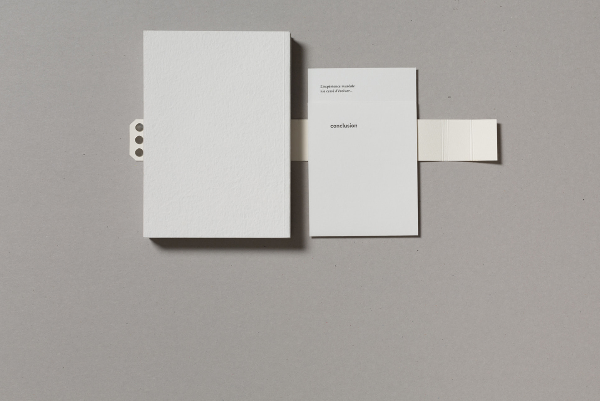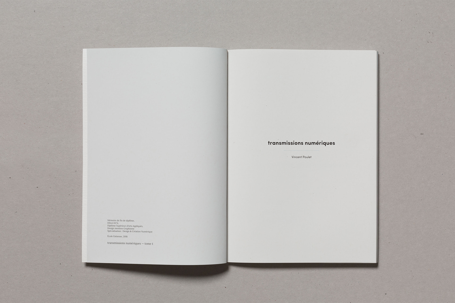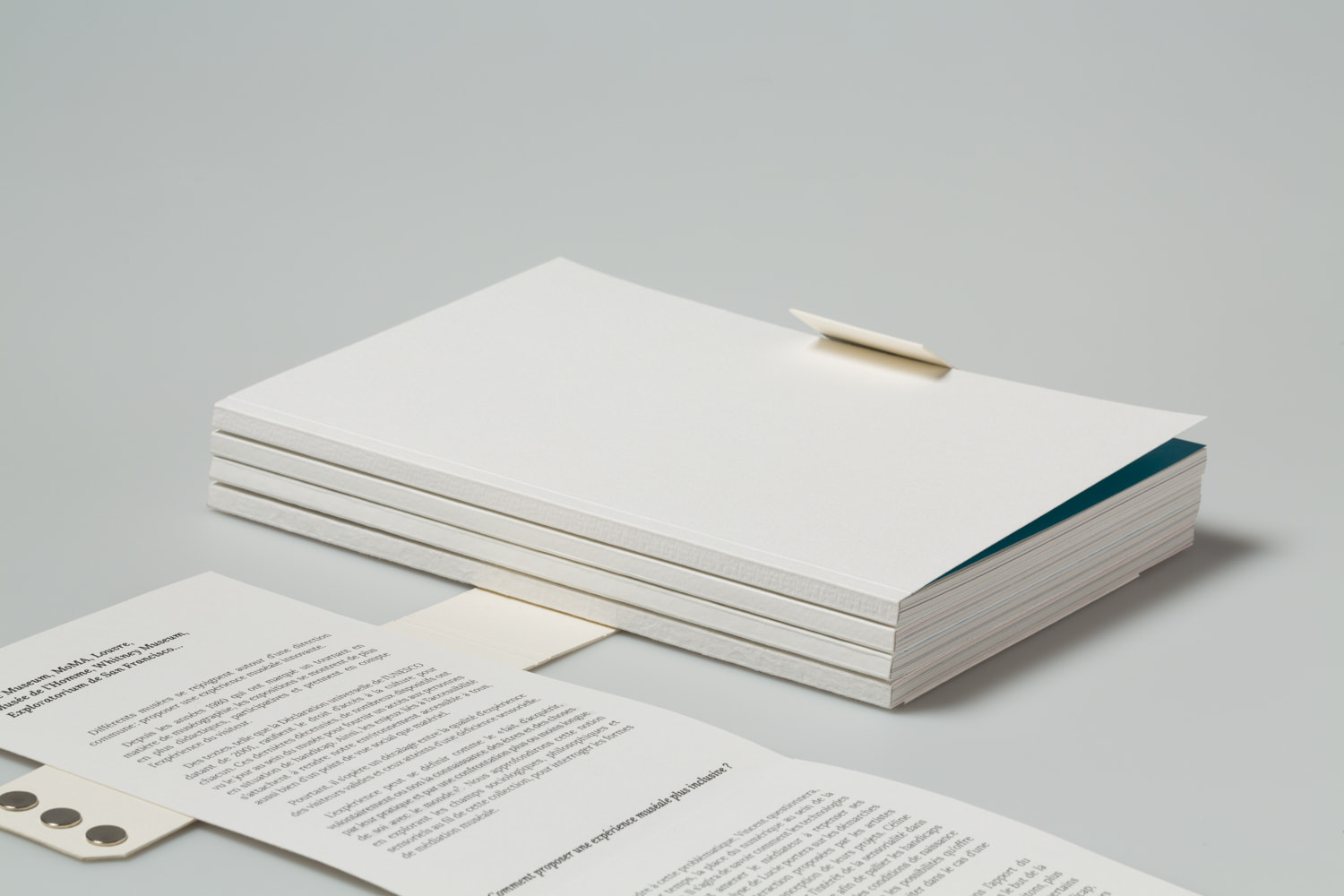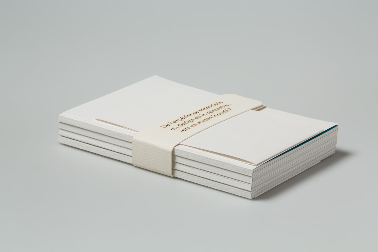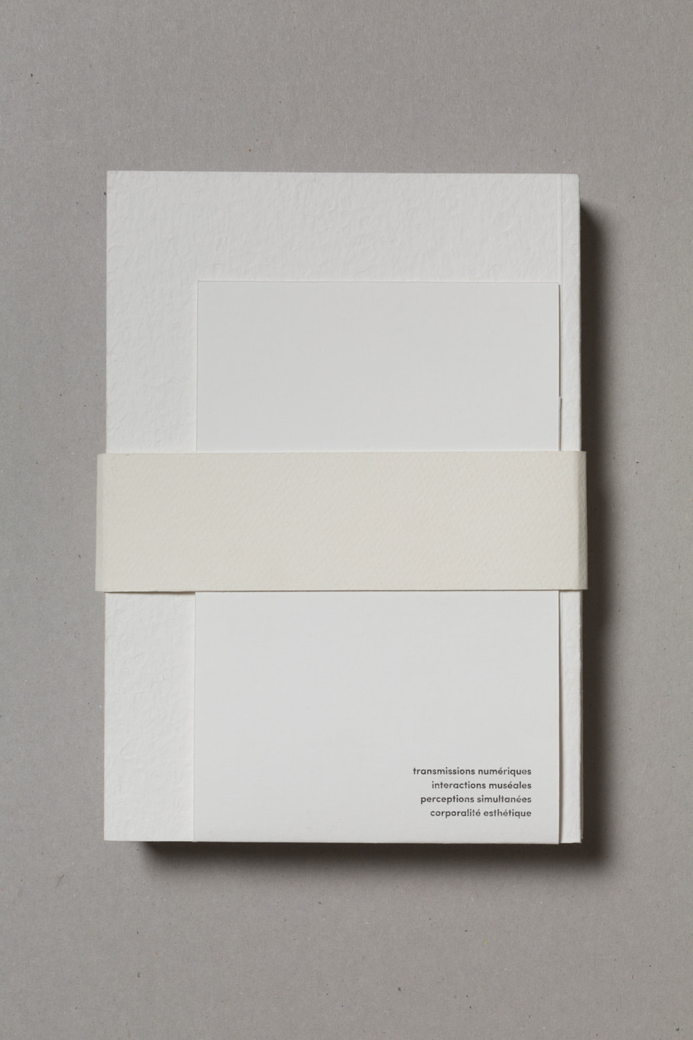 Notre projet de diplôme traitant de l'accès à l'art à tous et notamment aux déficients sensoriels, nous avons choisi de mettre en avant la matière. Ainsi, nous avons souhaité laisser le papier vierge de toute information sur la couverture. La perception sensorielle est mise en avant, chaque couverture possédant une texture qui lui est propre, et qui évoque le contenu du mémoire. La maquette reflète également notre envie de créer du lien, par l'usage de filets liant les différents éléments, ou encore par la mise en exergue des paroles d'artistes, scientifiques ou sociologues par un surlignement coloré.