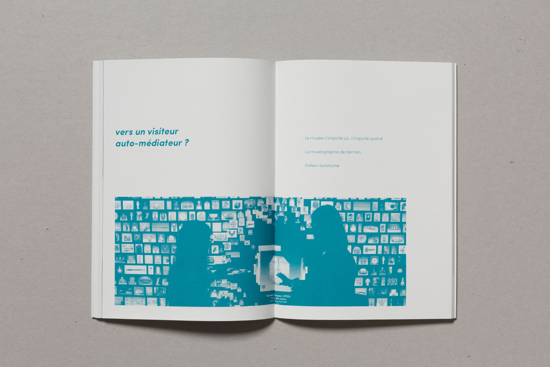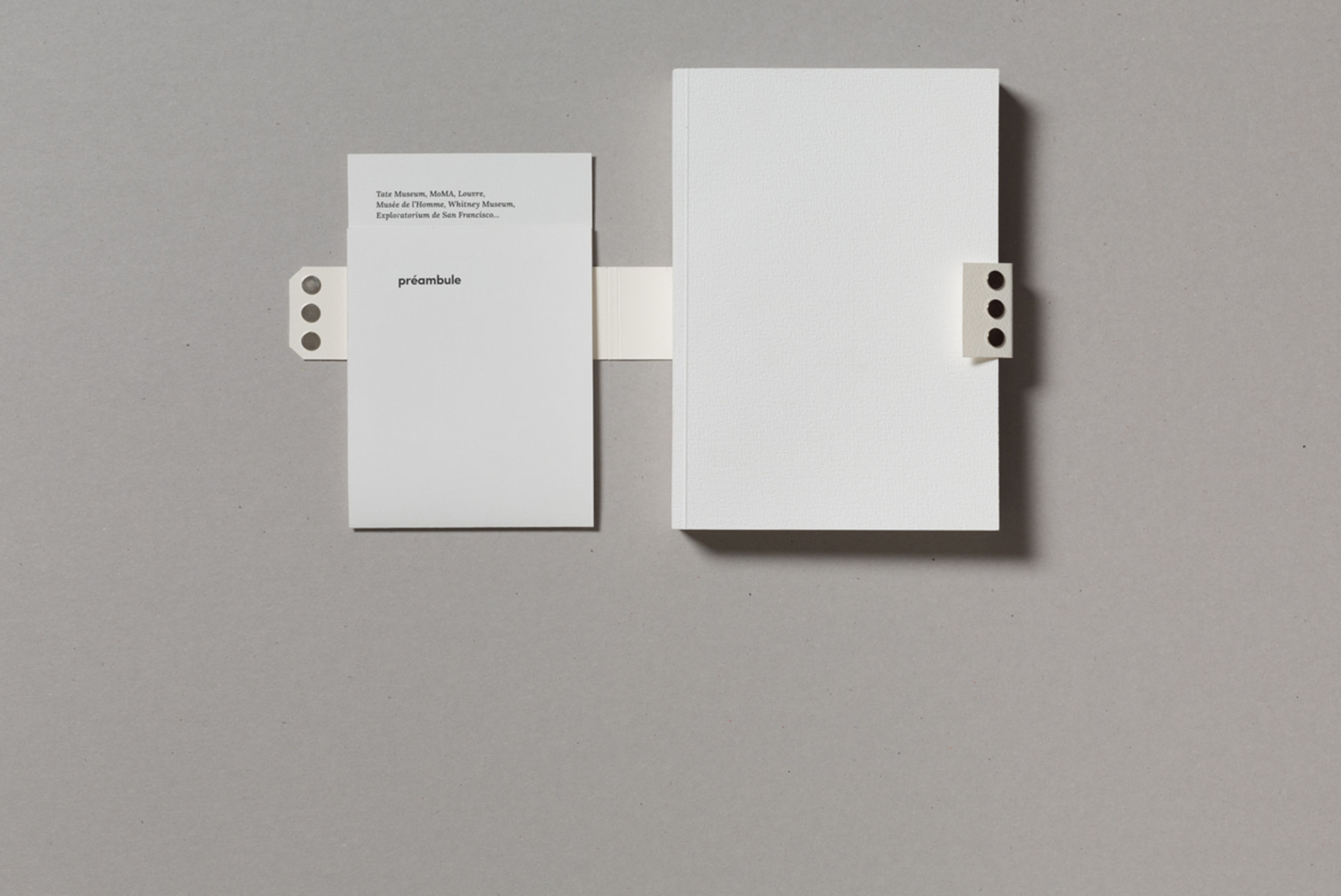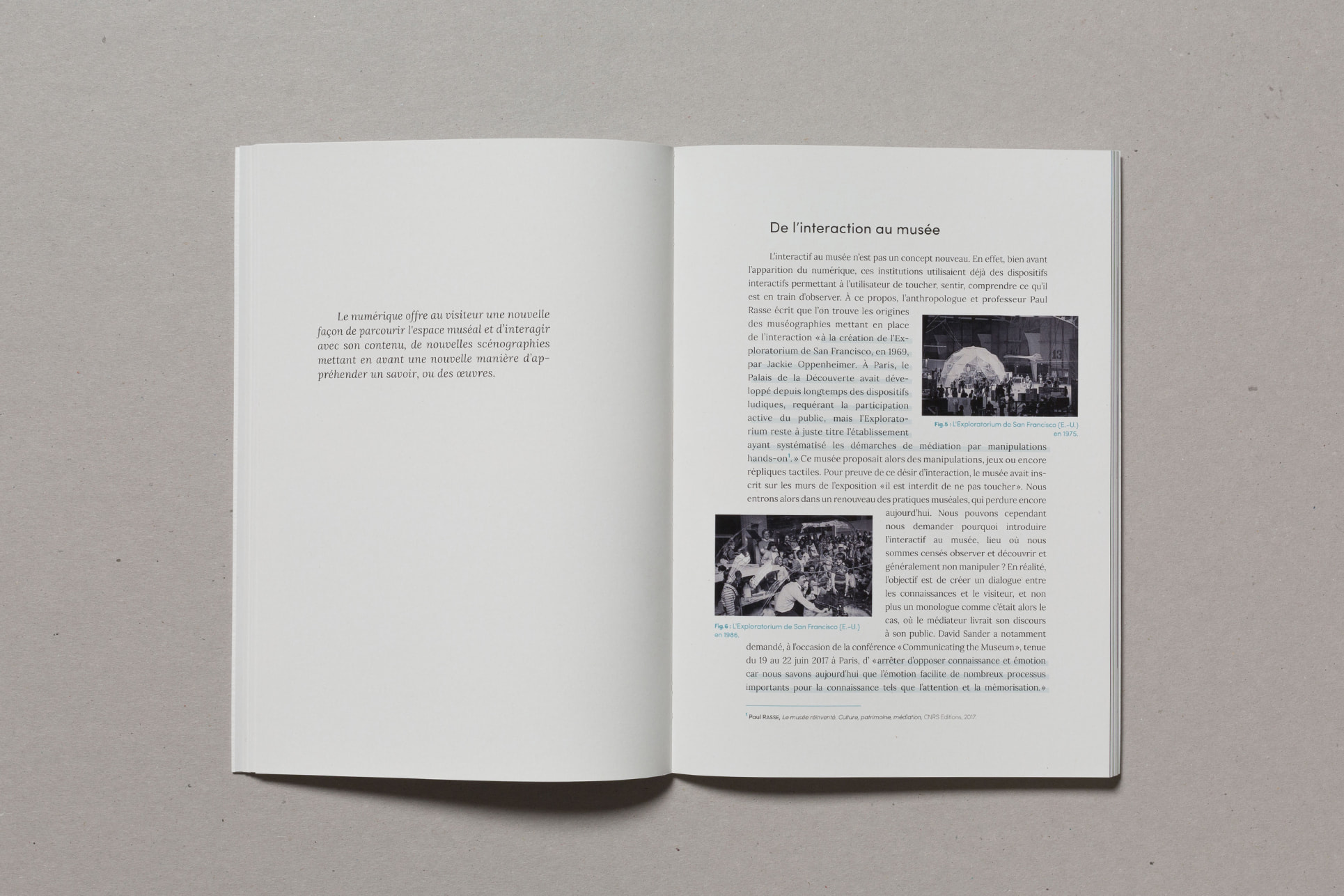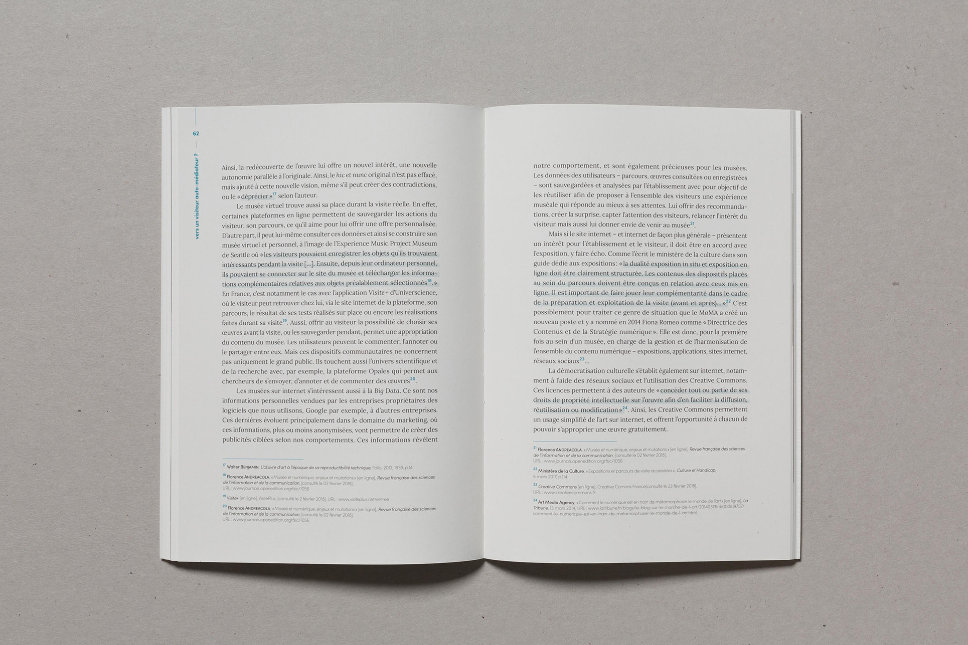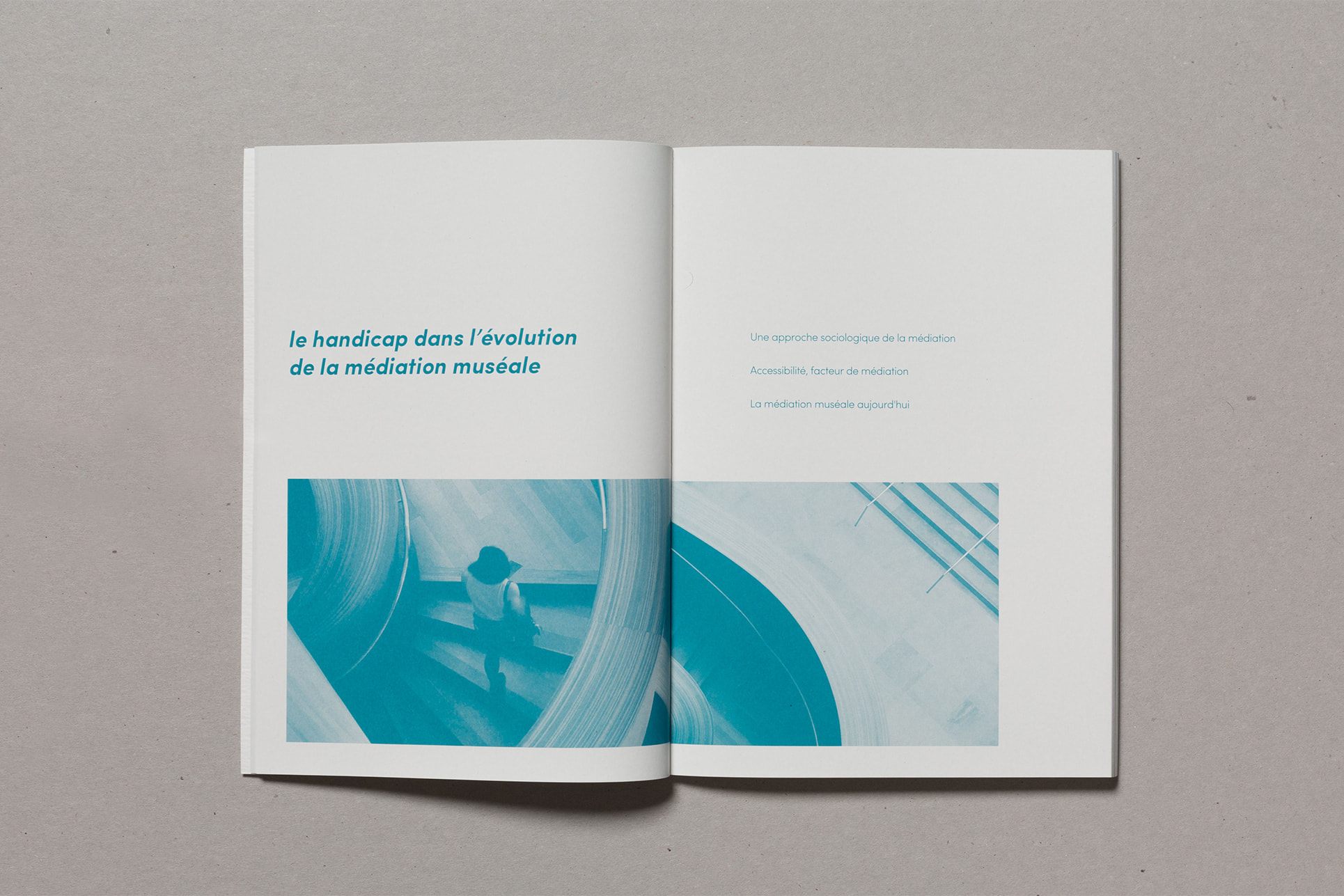 Notre projet de diplôme traitant de l'accès à l'art à tous et notamment aux déficients sensoriels, nous avons choisi de mettre en avant la matière. Ainsi, nous avons souhaité laisser le papier vierge de toute information sur la couverture. La perception sensorielle est mise en avant, chaque couverture possédant une texture qui lui est propre, et qui évoque le contenu du mémoire. La maquette reflète également notre envie de créer du lien, par l'usage de filets liant les différents éléments, ou encore par la mise en exergue des paroles d'artistes, scientifiques ou sociologues par un surlignement coloré.