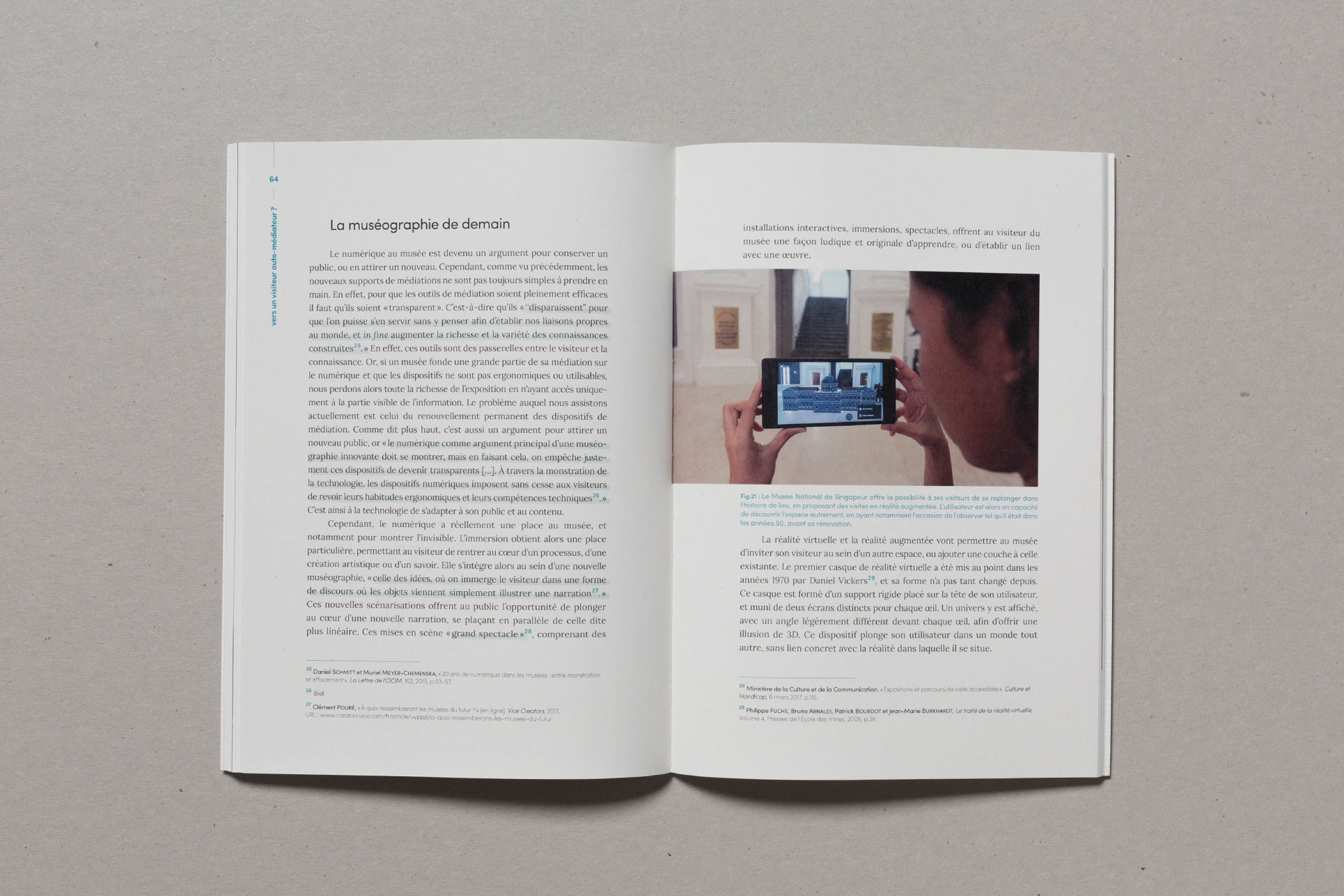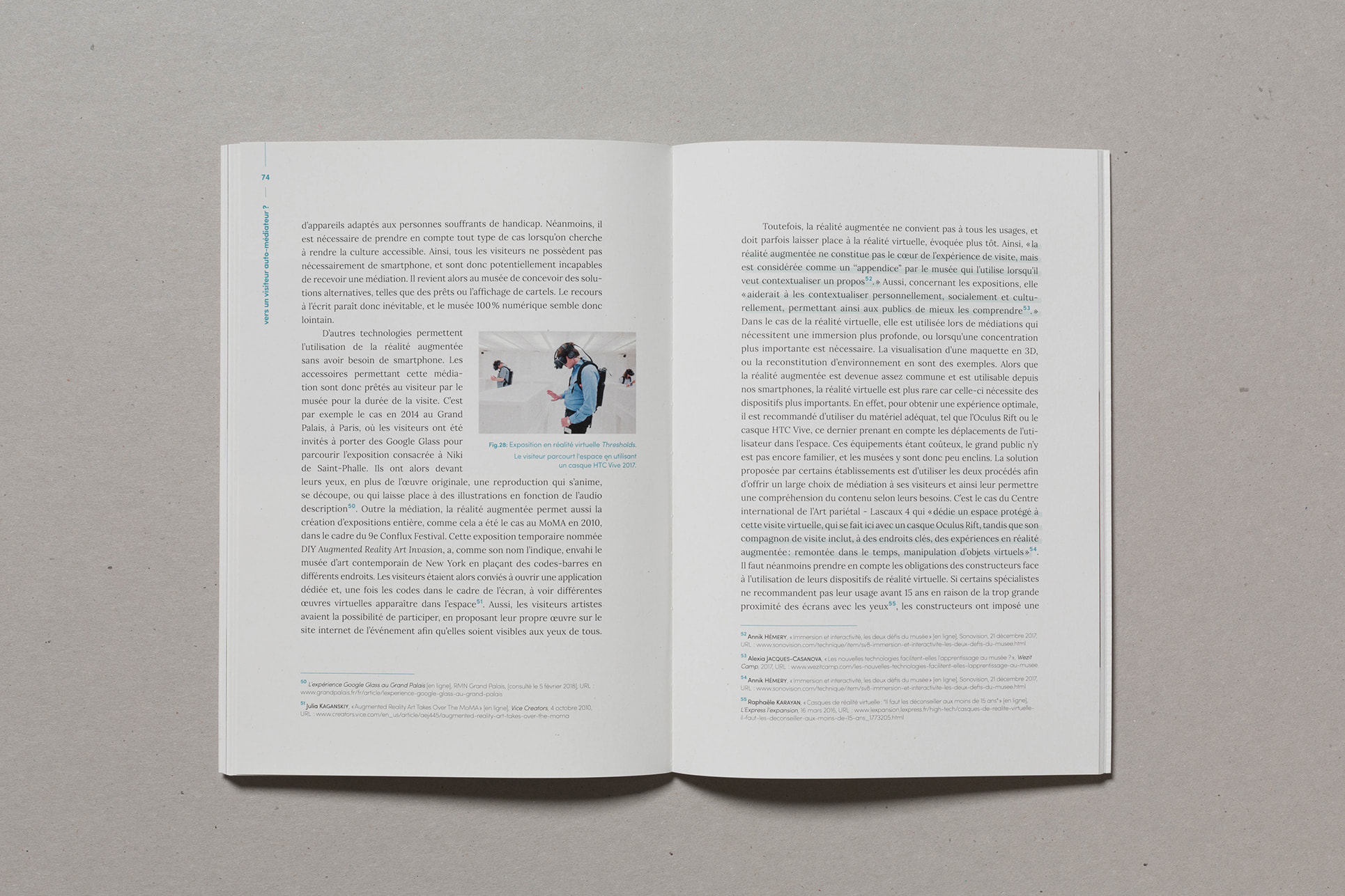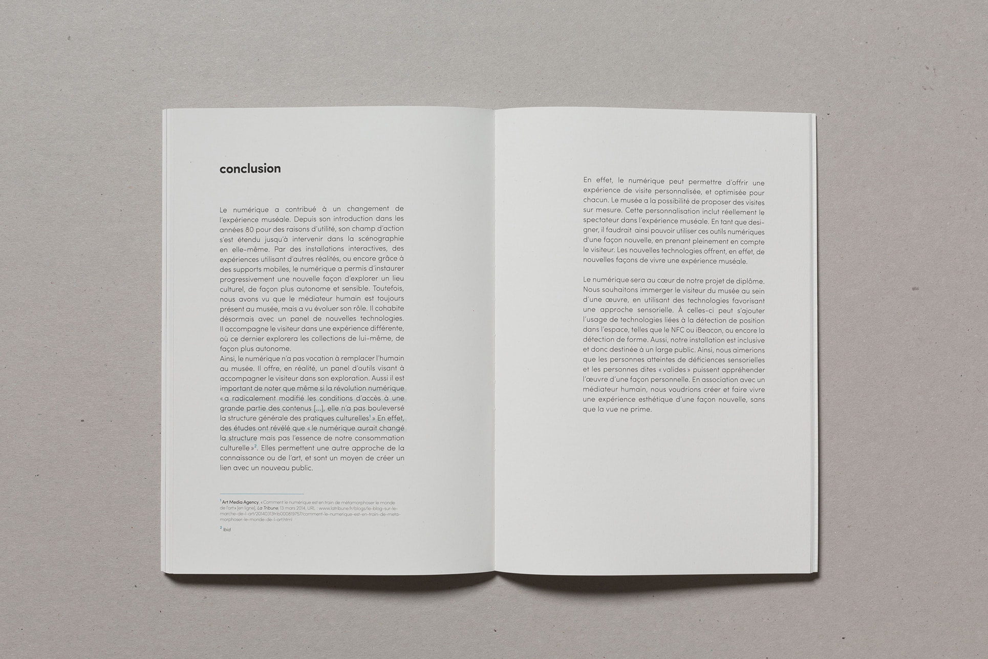 Dans le cadre de mon DSAA DCN à l'École Estienne, j'ai rédigé un mémoire de recherche en design traitant de la place du numérique au sein de la médiation muséale de demain. Directement lié à mon projet de diplôme, il a pour objectif d'alimenter sa réflexion, et s'intègre dans une collection nommée "De l'expérience sensorielle au design de la rencontre : vers un musée inclusif ?". Celle-ci est composée de quatre mémoires traitants un même questionnement : Comment proposer une expérience muséale inclusive innovante ?